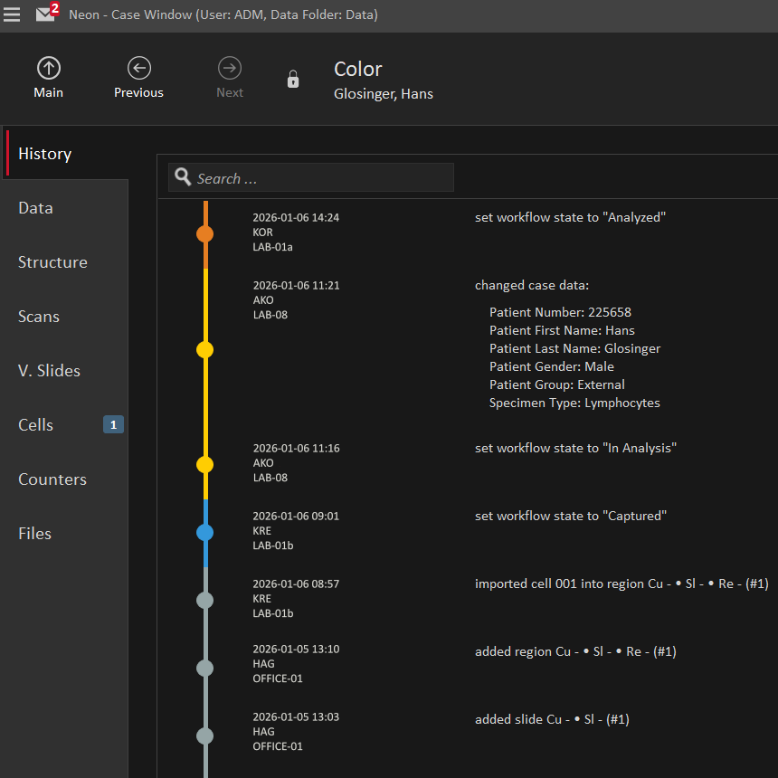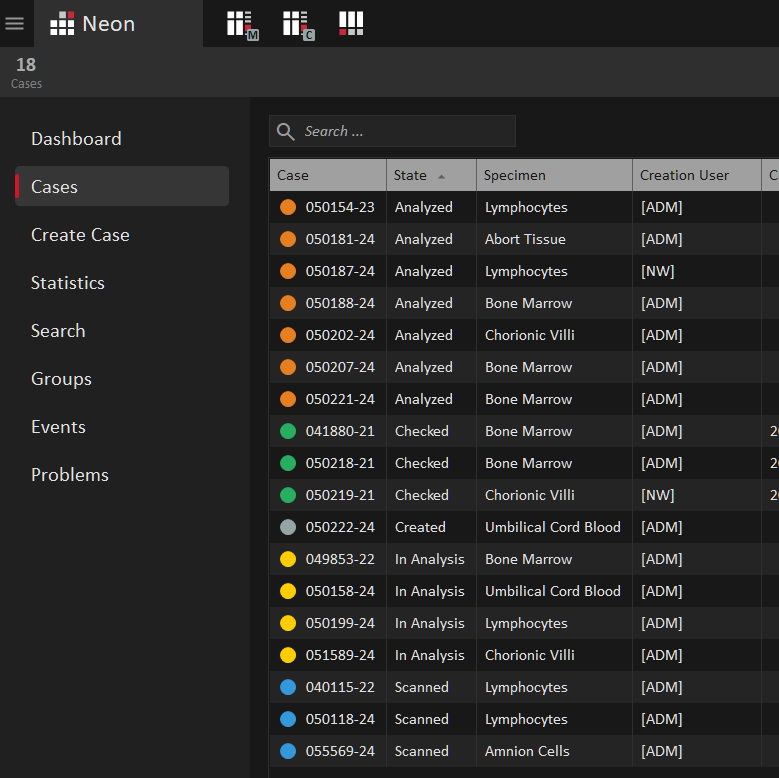 Neon provides a comprehensive view and monitoring of all aspects of the laboratory’s entire routine workflow. Color-coded markers assist users in tracking case statuses. Workflow configurations can be customized and automated, with the option for recording specialized and optional steps using sub-workflows.