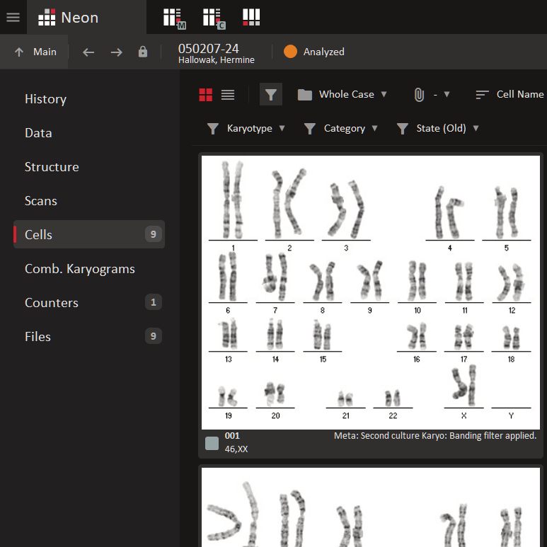 In the Case View window, all relevant case information is accessible through the case view tabs, presenting details such as the number of available Metafer scans, digital slide images, and cells. From this area, users can also create and organize combined karyograms, counters, and any attached external files. The cell gallery serves as the central image repository for each case, with a configurable footer displaying details such as remarks, coordinates, and karyotypes. Square-shaped flags indicate the workflow status of each cell, providing a clear overview of progress.